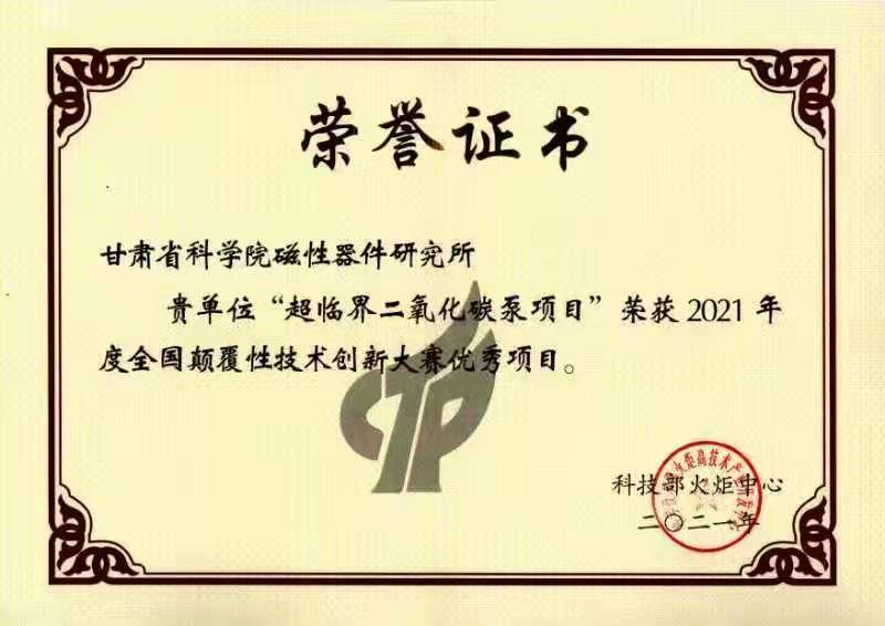 祝賀我單位榮獲 “超臨界二氧化碳泵項目 ” 2021年度全國顛覆性技術創新大賽優秀項目